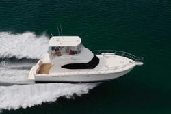 Управлять Riviera 45 ее владельцу предстоит с открытого мостика. На нем сосредоточены все органы управления яхтой, а также собственная аудиосистема и мини-бар с холодильником. Подняться на "флайбридж" можно по удобной стационарной лестнице, ступеньки которой, как и большая часть палубы, отделаны тиковым деревом. Для удобства в ночное время все ступеньки имеют светодиодную подсветку. Перила и поручни на палубе выполнены из полированной нержавеющей стали.