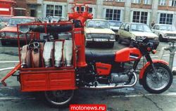 Некогда в Советском союзе на вооружении пожарных была вот такая вот специализированная мототехника - практически пожарная машина в миниатюре и мотоциклетном воплощении.